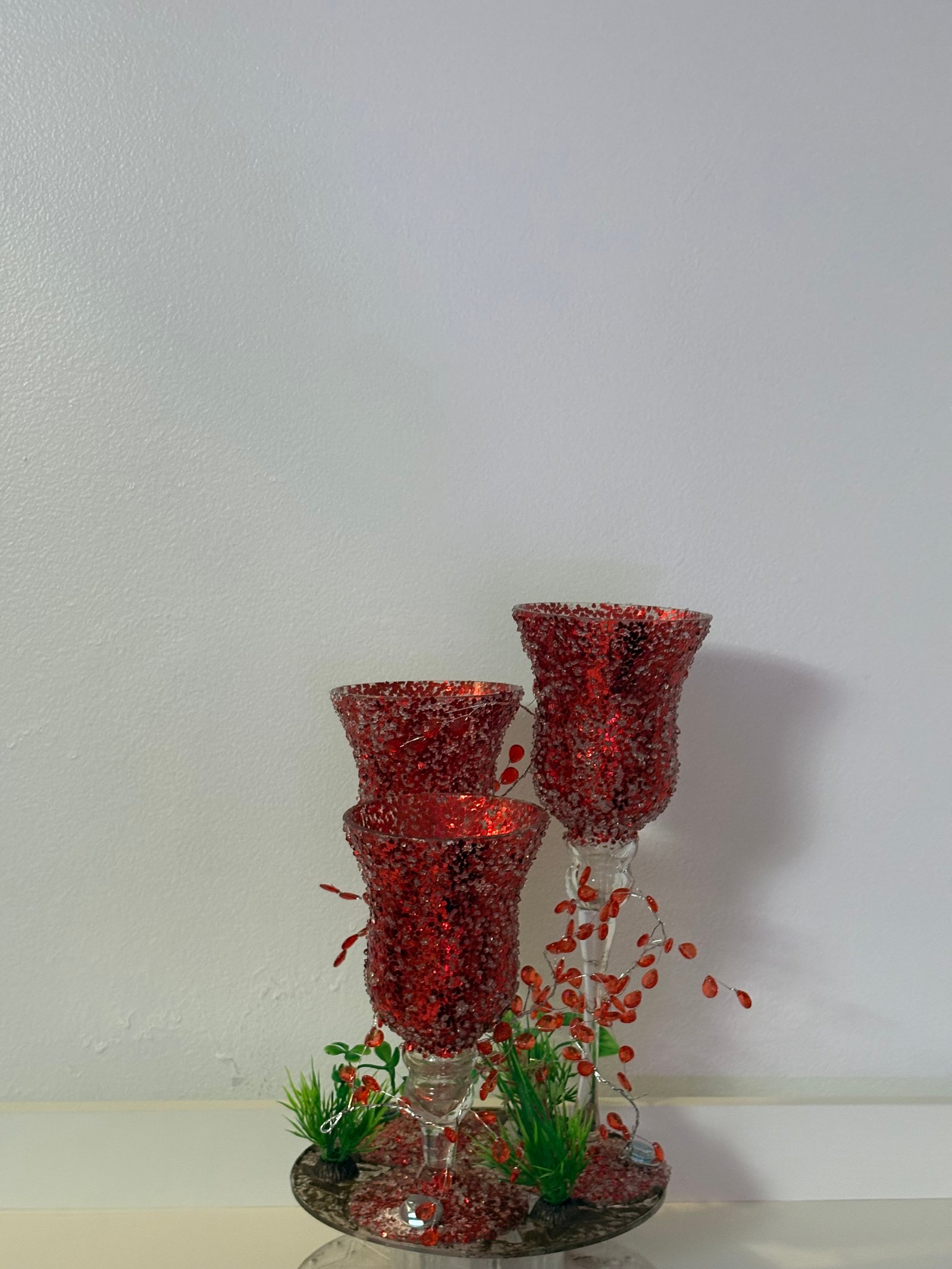 Handcrafted Red Crystal Glass Candle Holder Centerpiece – Set of 3 Luxury Decorative Glasses